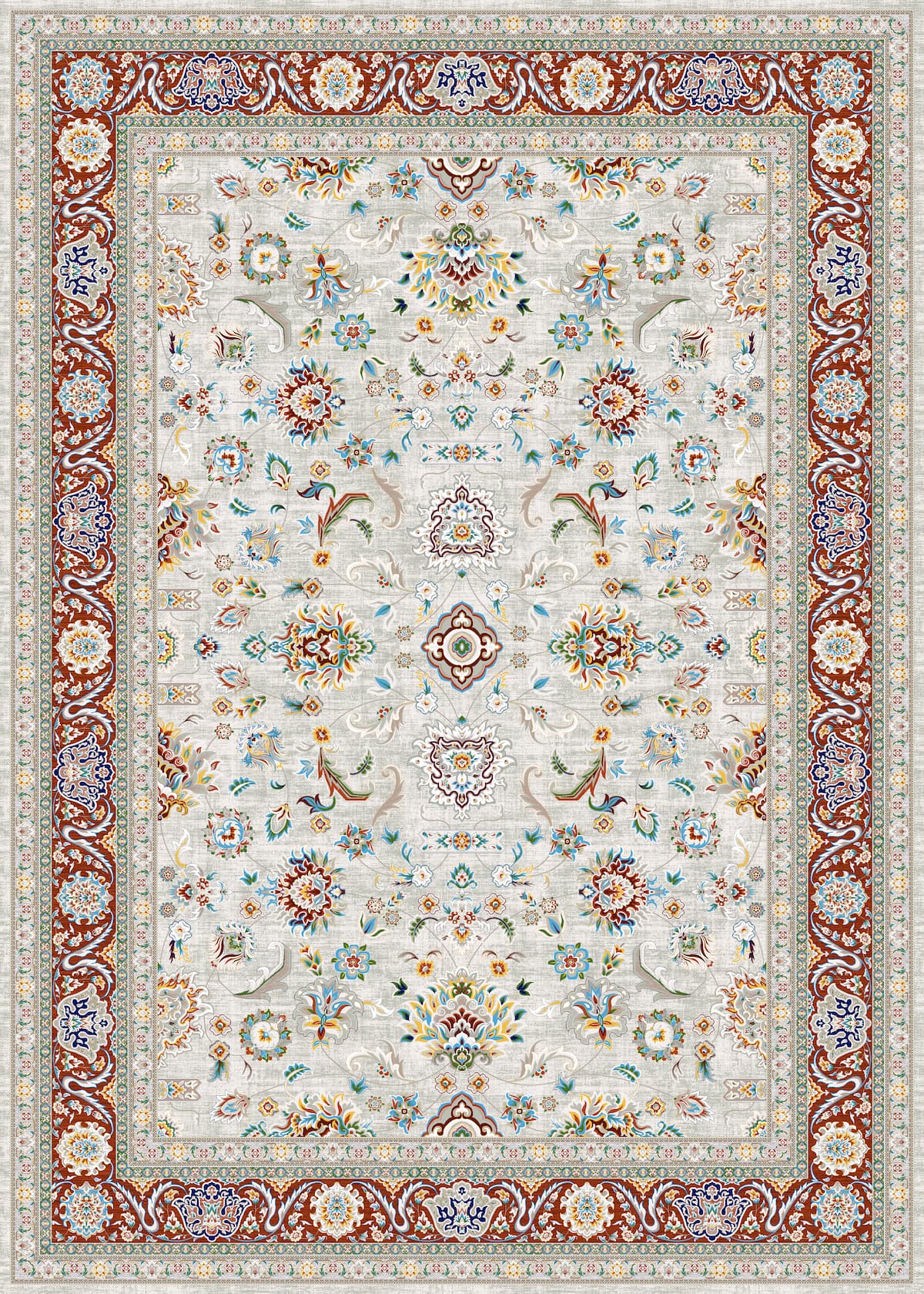 رنگ ترمه ای این مدل، نماد شکوه و اصالت است و بهراحتی با دکوراسیونهای کلاسیک، نئوکلاسیک و حتی مدرن هماهنگ میشود. بافت فلت (Flat) باعث میشود فرش بدون پرز، سبکتر و مناسب برای محیطهای پرتردد باشد.